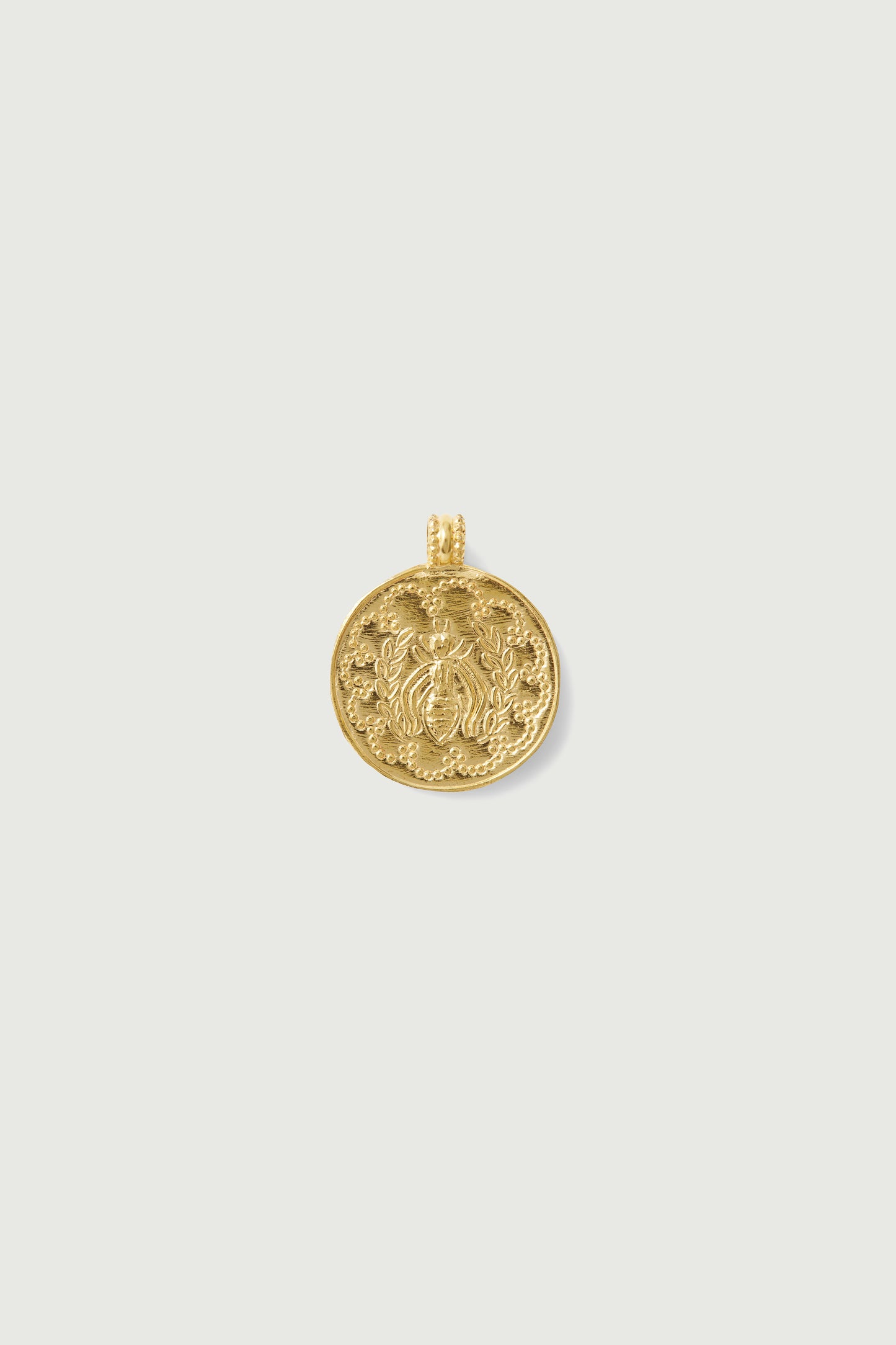DOMITILLE 3 is a round vermeil pendant decorated with a bee. The motifs inside the medal are engraved by hammering.